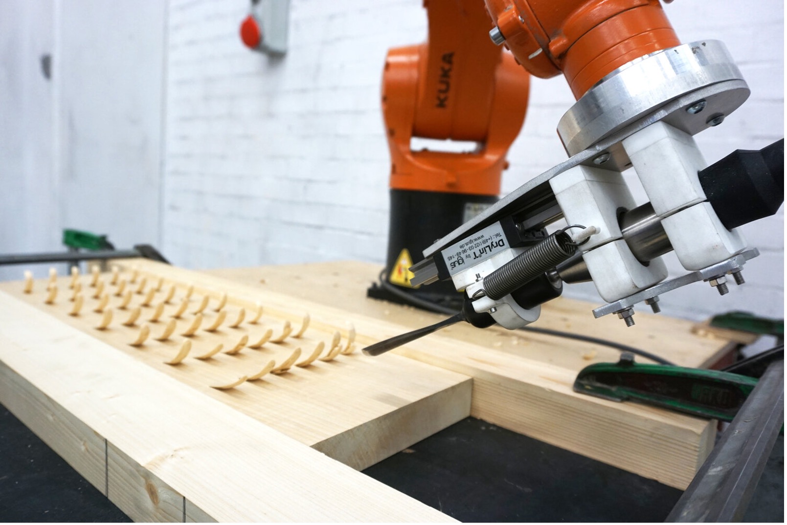 The adaptive robotic carving project uses robotic arms from the company KUKA, which are market leaders in automation and robotics. Specifically, the KR 120 R2500 pro and KR 210 R3100 ultra models are used, which have a reach of 2,500 and 3,100 mm respectively, and a load capacity of 120 and 210 kg. These robotic arms are equipped with non-standard carving tools, such as knives, saws or planers, which are adapted to the properties and behaviour of the wood.